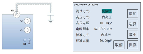 3、反接屏蔽法測量CVT上端C0的電容值和介損測量模式:反接法。電壓≤2kV